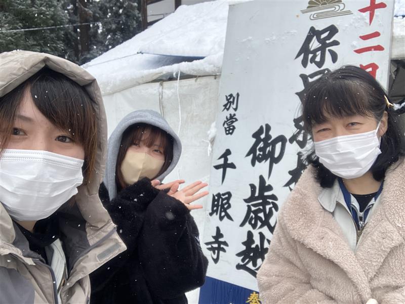 大雪の降る中、餅振る舞いを楽しみに千眼寺・保呂羽堂へ向かいました。